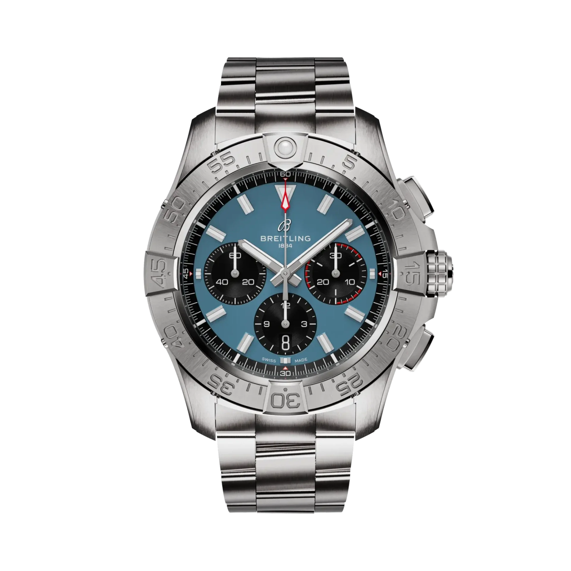 Breitling heeft de Avenger collectie vernieuwd en heeft een hoop veranderd. Deze in een nieuw jasje getrokken Breitling is gemaakt van edelstaal en heeft een leren of metalen band die valt te sluiten door gebruik te maken van de vouwsluiting. De kast van dit model heeft een diameter van 44 mm en herbergt een automatisch B01 uurwerk die een gangreserve heeft van circa 70 uur. De blauwe wijzerplaat met chronograaf wordt beschermd door een sterk saffierglas. Het horloge is getest op een indrukwekkende waterdichtheid van 300 meter.